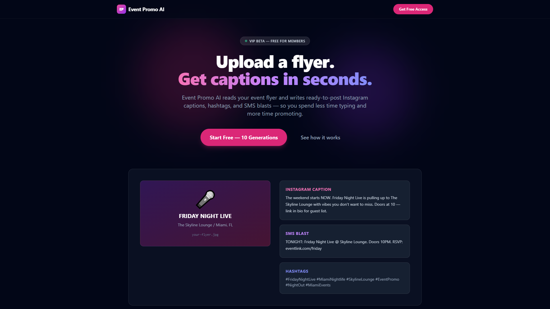 Upload a flyer, get ready-to-post Instagram captions, hashtags, and SMS blasts for your event in seconds.
