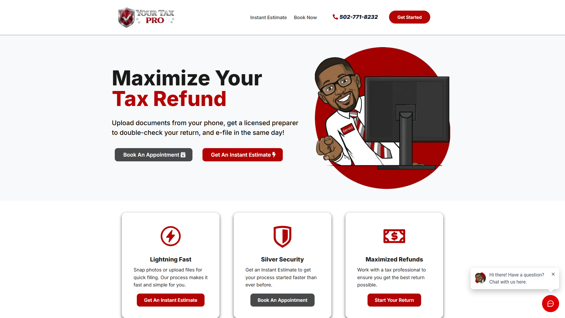 Tax prep site with instant estimate flow, appointment booking, and mobile document upload for e-filing.