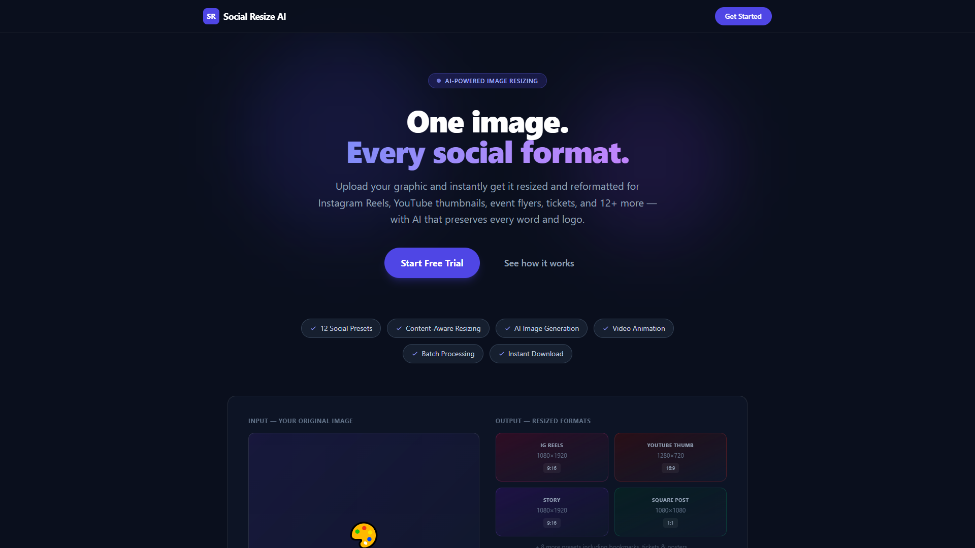 One-image-to-every-social-format AI tool. Upload once, get 12+ presets — reels, thumbnails, flyers, tickets — with text and logos preserved.