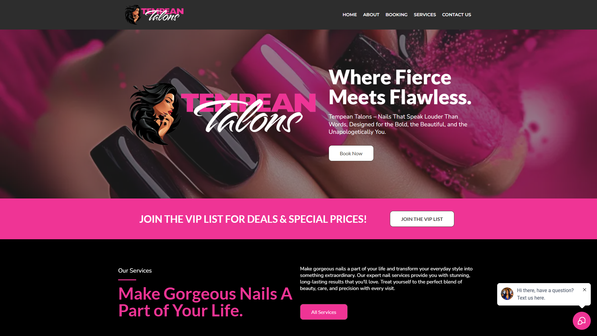 Nail salon site — "Where Fierce Meets Flawless" — with booking, VIP list capture, and services showcase.